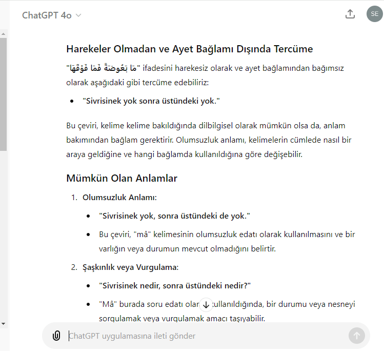 Şüphesiz Allah verdiğine misal hayat vermez dişi sivrisinek ve sonra onun üzerindeki gibi. Ve amenü edenler bilirler ki şüphesiz o Rabb’lerinden gelen bir Hakk’tır. Ve kefere(örten) kimselere gelince onlar; “Allah bu misalle ne demek istedi? Onunla bir çoğunu saptırıyor ve onunla da bir çoğuna hayat veriyor.” derler. Ve onunla aldananlar yalnızca fasıklardır.