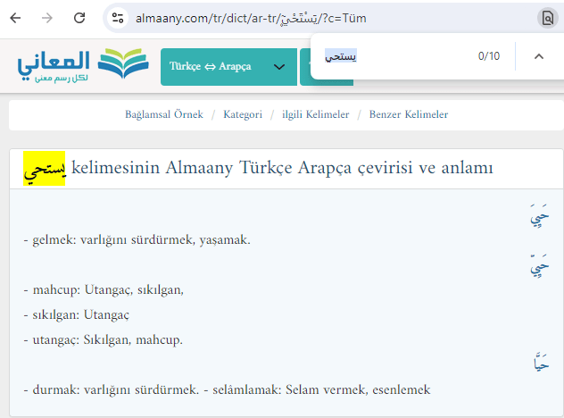 - “يَسْتَحْيِي (yestahyî)” fiili, حئ (ح ء) kök kelimesinden türetilen ( اَسْت+حيِي ) birleşenlerinden oluşur. اَسْتَحْيِي (estahyi) fiili gibi “اسْتَ (elif+sin+te)” ön ekiyle yapılan اِسْتِفْعَال (istif’al) fiil formuna benzerdir. Ancak eylemi/fiili her zaman uygulanabilir ve sürekli bir uygulama haline getirmek için ön eki olan elif (ا) harfinin yerine ye (ي) harfi getirilmiştir.